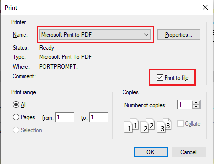 Step 4: Next Print Wizard open. Tick Print to file tab and then select “Microsoft Print to PDF” option.